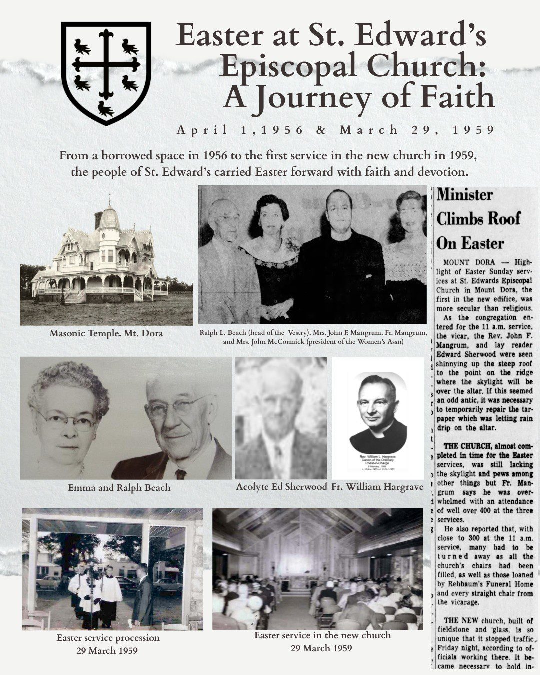 On April 1, 1956, parishioners gathered for Easter not in their church, but in the Masonic Temple in downtown Mount Dora, their temporary home. Seventy-two people came together that morning, including thirteen children in Sunday School, filling the space with prayer, hope, and joy. Fr. Hargrave was the Priest in Charge.
