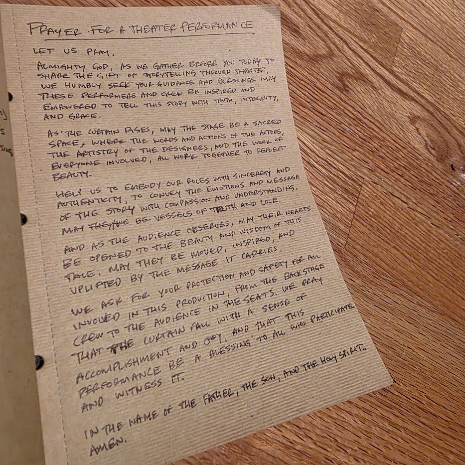 After the reflection, I pray over them with a written prayer asking God to guide their work, to help them embody their roles with sincerity and authenticity, to make the stage a sacred space where truth can be told. Then comes the ritual that gives this gathering its name.