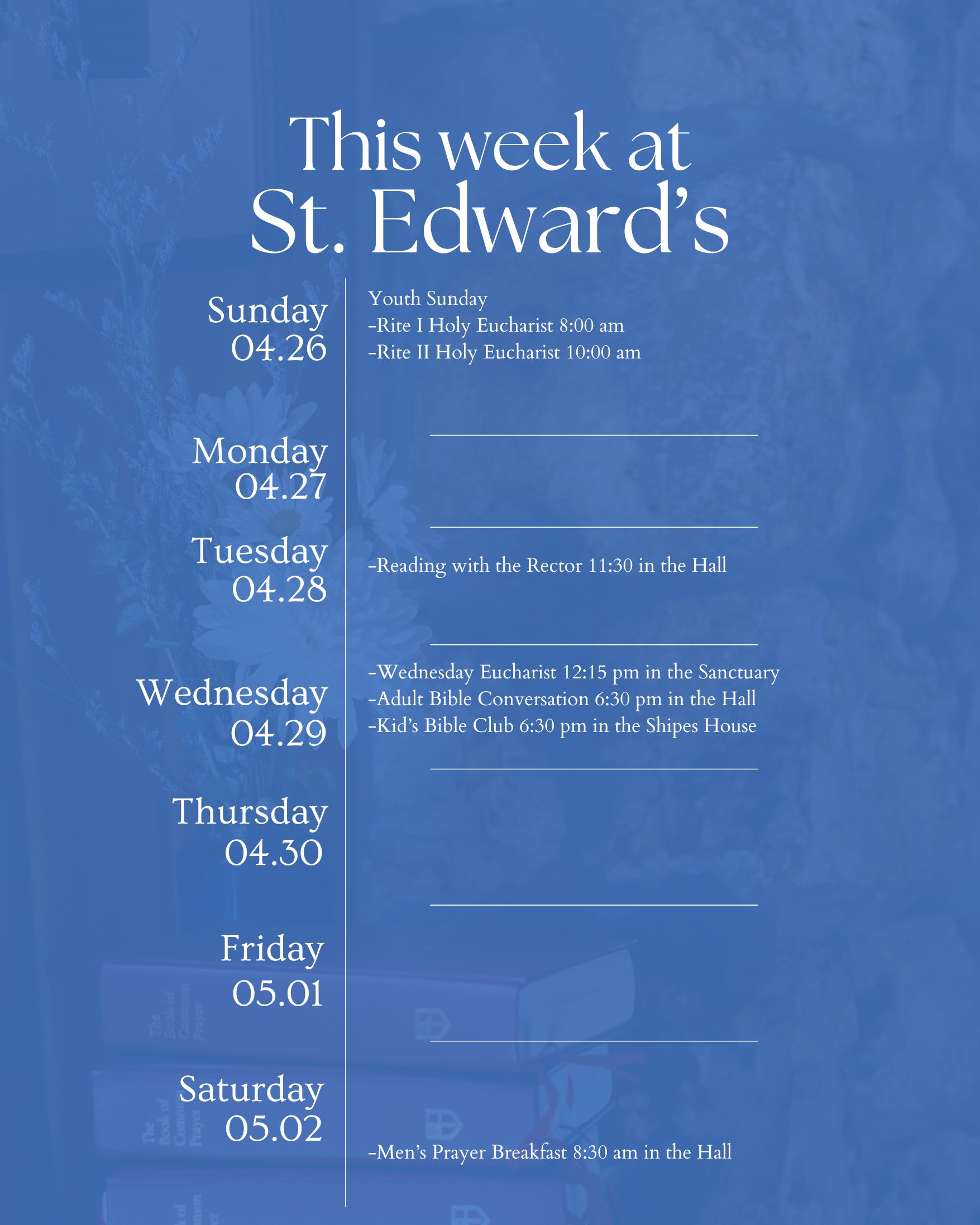 ","location":[{"@type":"Place","name":"St. Edward's Episcopal Church","address":{"@type": "PostalAddress","streetAddress":"460 N. Grandview Street"}}],"eventStatus":"https://schema.org/EventScheduled"}